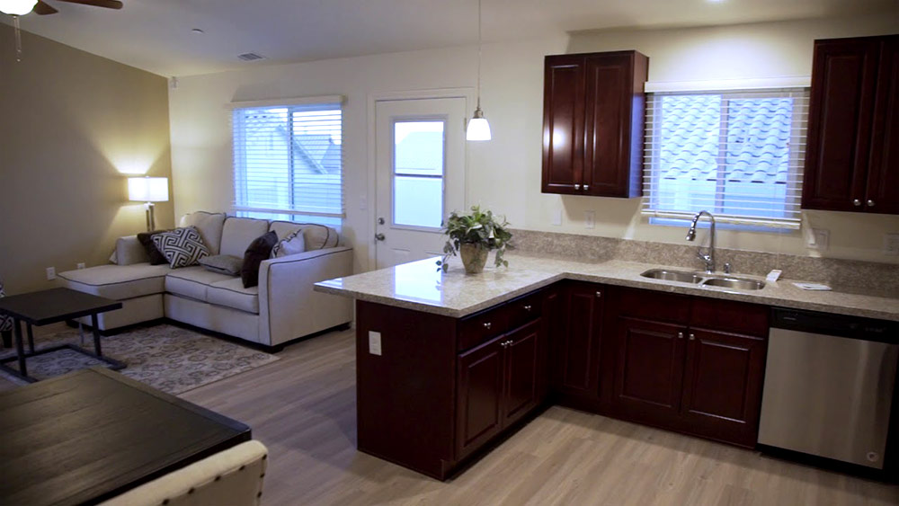 The 2-bedroom units feature 1,074 square feet of single-story living space with two bathrooms, attached 427 sq ft garages, and large 380 sq ft patios. These homes are perfect for couples or individuals who want comfort and privacy. The open layout enhances daily living while offering efficient space utilization.